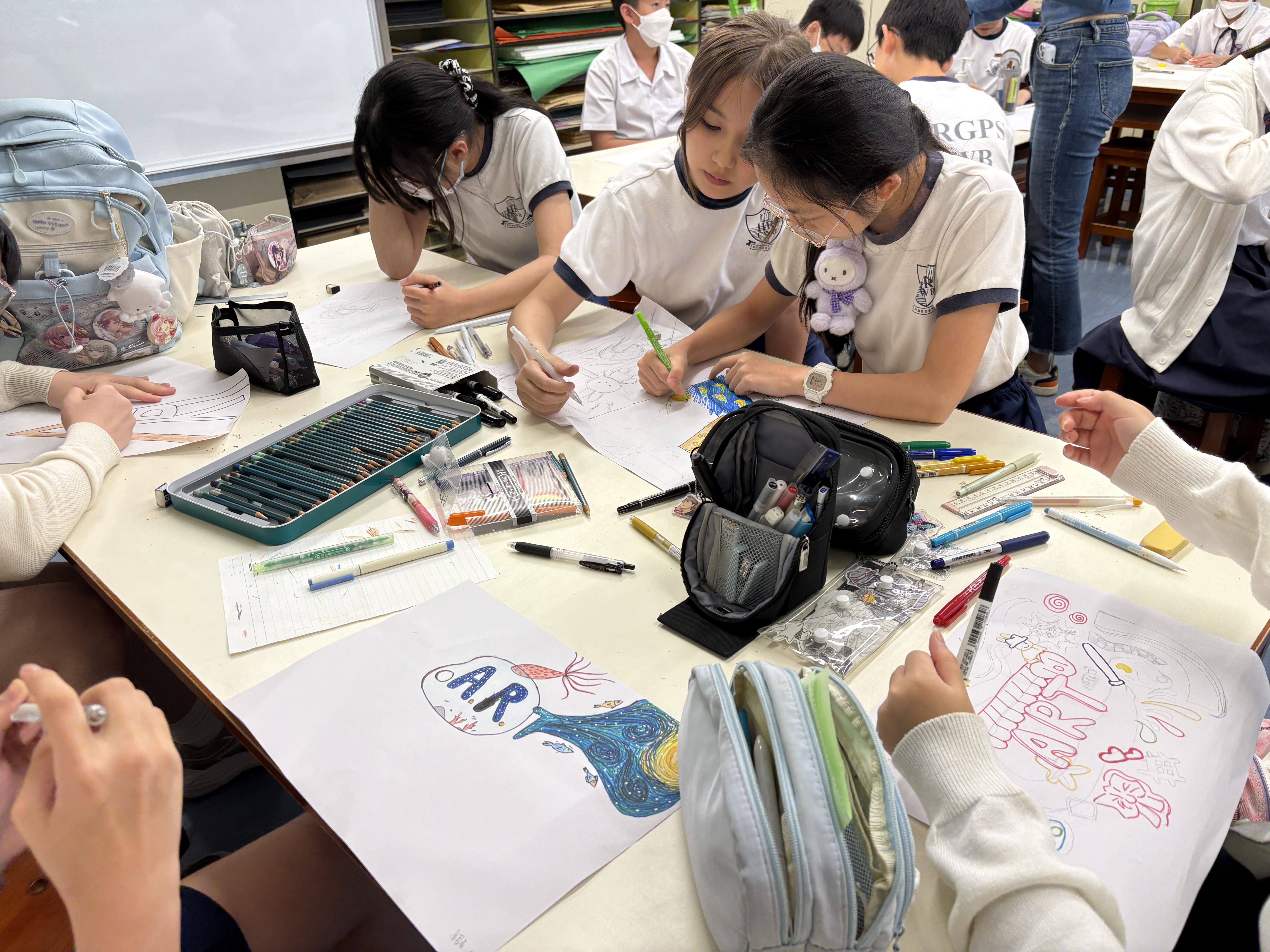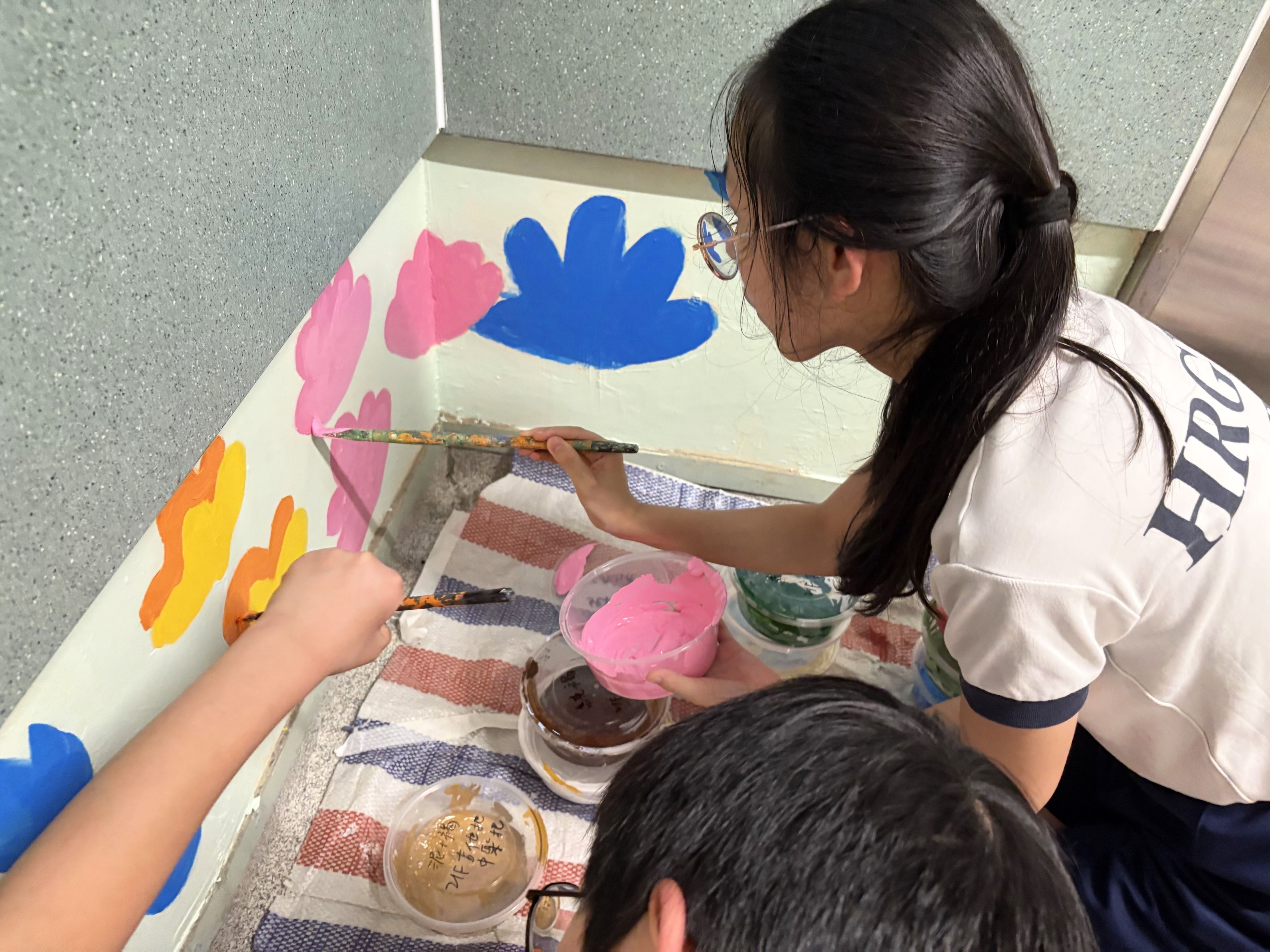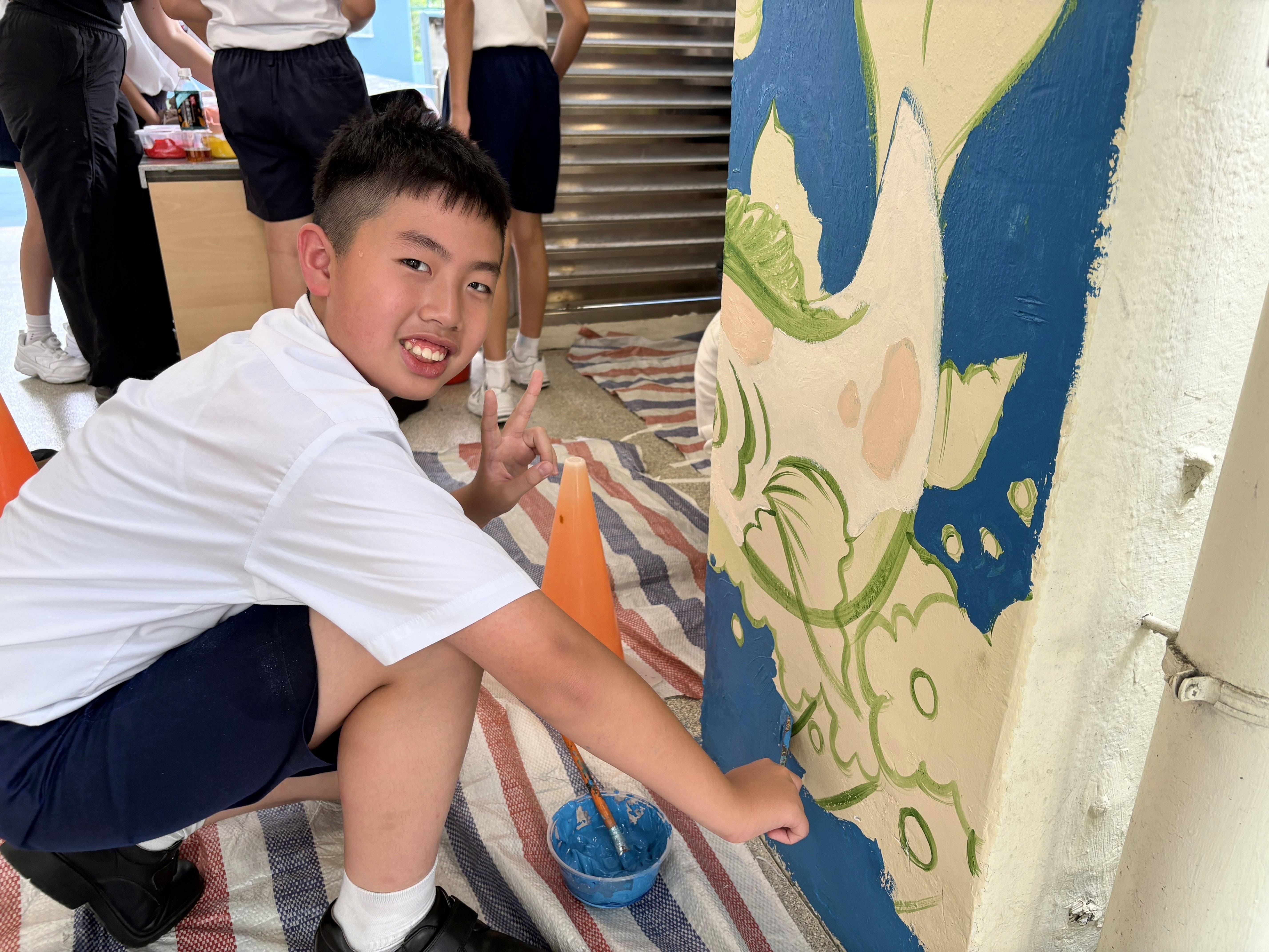 2025.04.30校園壁畫工作坊 本年度六年級同學繼續承傳準畢業生精神,在導師引導下學生構思壁畫設計,運用壁畫繪畫技巧來完成壁畫及校園美化,在A座及C座校舍美化兩幅牆壁。工作坊讓同學發揮藝術潛能,以及在校園內留下一份美好的禮物。