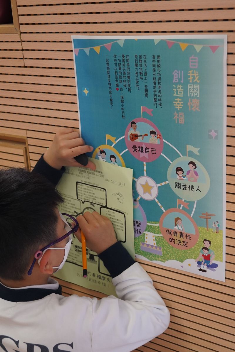 為鼓勵學生了解精神健康問題、協助師生和家長學習放鬆及照顧自己的身心健康,本校於11月28日舉行「精神健康日」,於小息時段向學生發放精神健康訊息,並於學校設置「精神健康角」,幫助學生釋放壓力,並表達對別人的關懷和支持。